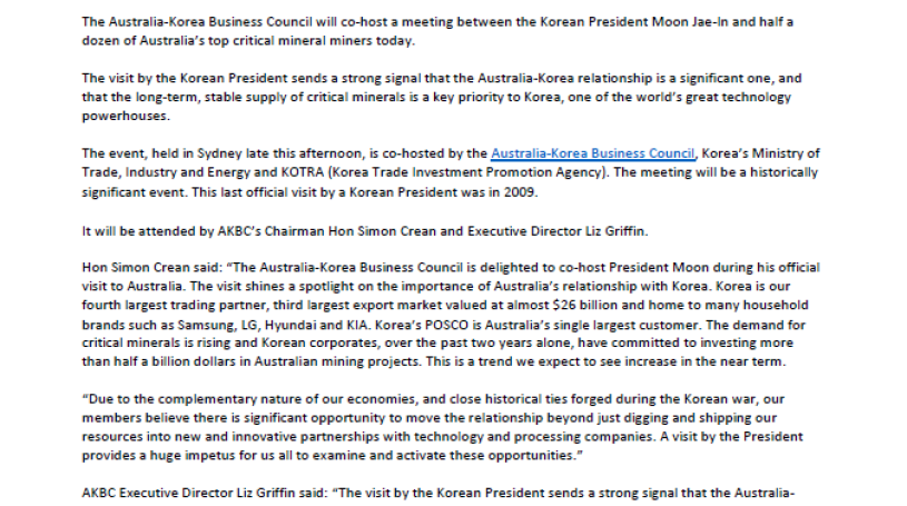The Australia-Korea Business Council is pleased to issue a Media Release ahead of our critical minerals supply chain roundtable with the South Korean President Moon Jae-In this afternoon.