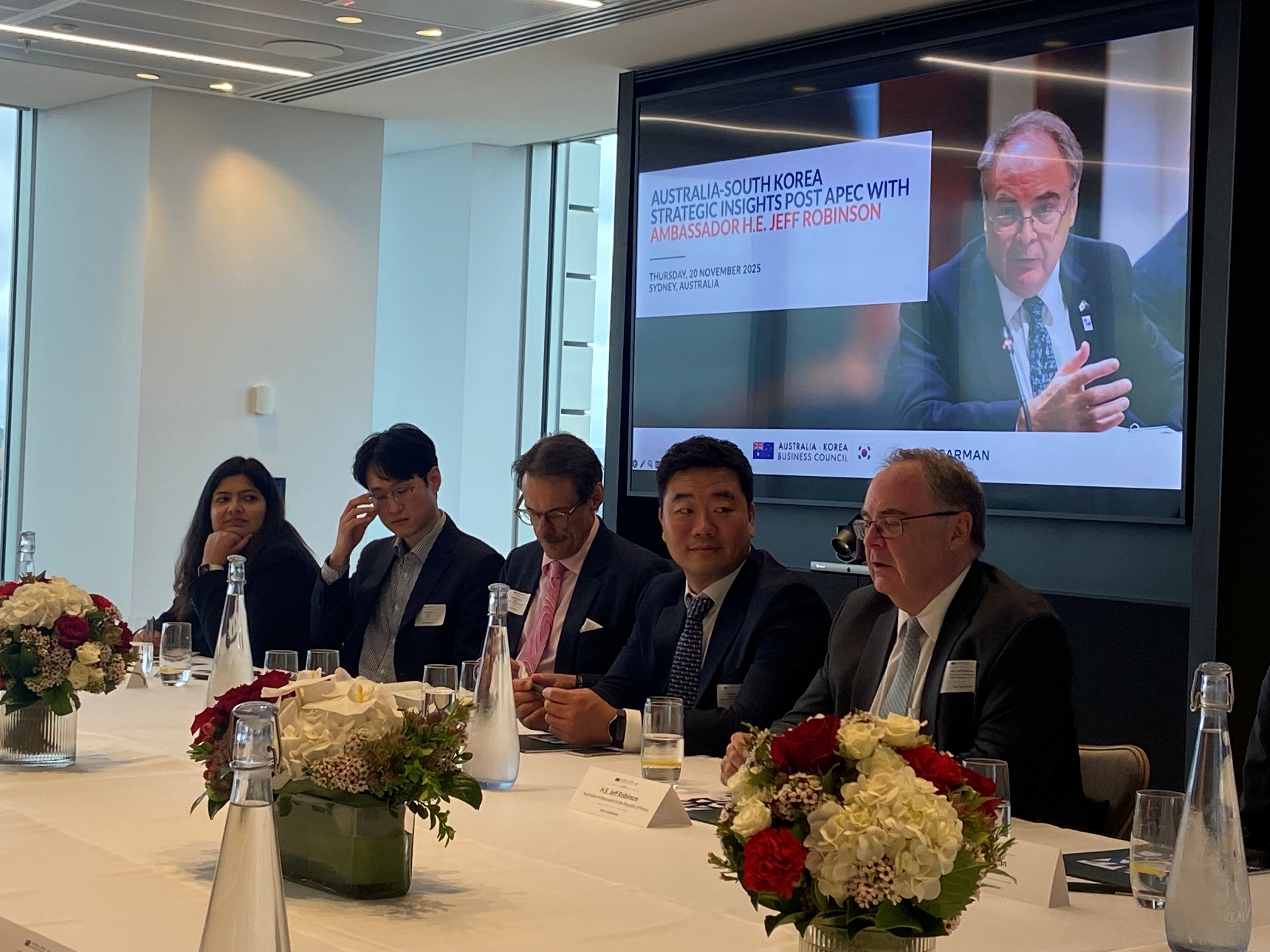 On Thursday, 20 November, the Australia–Korea Business Council (AKBC) hosted the Australia–South Korea Strategic Insights with Ambassador H.E. Jeff Robinson at the new Sydney office of AKBC Member A&O Shearman. This private roundtable brought together AKBC Members from our highest membership levels in New South Wales in an intimate setting to continue the important dialogue on shaping and strengthening the Australia–Korea relationship. The roundtable provided an opportunity for members to engage directly with the Ambassador and exchange views on strengthening bilateral collaboration and advancing shared economic priorities across the Australia–Korea corridor.