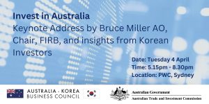 AKBC and Austrade are delighted to invite you to join us for a dinner briefing from Mr Bruce Miller AO, Chair, Foreign Investment Review Board (FIRB). Mr Miller will discuss regulations and trends in foreign investment from Korea into Australia.