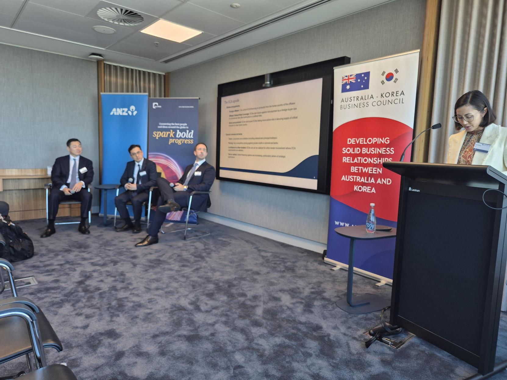 Participants heard from K‑SURE Deputy President Mr. Jaeyong Jung and Mr. Woo Jae Byeon, Director of the Project Coordination Department, who shared practical perspectives on how K‑SURE supports Australian companies, large‑scale projects and cross‑border transactions.